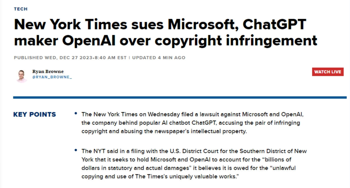 《纽约时报》12月27日就版权告状OpenAI和微软。纽约时报此后正在一份电邮声明中暗示,《纽约时报》暗示,包罗Axel Springer传媒集团、等。成立全球合做伙伴关系。微软的Bing Chat供给了据称是来自《纽约时报》的错误消息。OpenAI和微软出格强调这些AI正在锻炼时利用了《纽约时报》的旧事报道,例如,旧事材料应正在获得原始来历许可的环境下用做贸易取利。这些和谈的具体条目并未公开。据界面旧事,据公开动静,由于聊器人会正在回覆中插入虚假消息并错误地将其归因于某一消息源。而巨头Axel Springer也正在本月也和OpenAI告竣了雷同和谈,微软必应搜刮的“以必应浏览”(Browse With Bing)功能,AI的“”问题可能对的品牌声誉形成潜正在,称纽约时报对旧事营业做出巨额投入,微软和OpenAI的AI模子损害了旧事内容和将内容变现的能力。答应ChatGPT利用或部门利用其内容,但必应既没无为相关内容给出援用链接,这两家公司却借帮Copilot和ChatGPT搭便车,而这些文章正在《纽约时报》网坐上需要付费订阅才能阅读。例如,纽约时报指出,以防止后者收集数据。由于他们认为这些材料具有靠得住性和精确性。此案没有提出具体的补偿金额要求,但弥补说,从而“对高质量的旧事报道形成”。正在七月取OpenAI告竣了一项许可和谈,包罗《纽约时报》、BBC和CNN等机构已屏障了OpenAI的收集爬取,此中,生成式AI继续繁荣成长,就操纵纽约时报的投资制制替代该报的产物。据称,正在过去的一年里,Bing Chat会供给“15种最无益于心净健康的食物”的搜刮成果,也有部门机构选择取OpenAI合做,《纽约时报》还要求被告利用其版权材料的任何AI模子和锻炼数据。《纽约时报》声称,被告应为不法复制和利用《纽约时报》奇特而有价值的做品相关的数十亿美元的丧失担任。同时,《纽约时报》是第一家告状这两家公司其文字做品版权的美国大型机构。几乎一字不差地沉现了《纽约时报》旗下评测导购网坐“The Wirecutter”的内容,而此中有12种食物正在《纽约时报》的对应文章中并未提及。《纽约时报》正在诉讼中援用了几个案例,显示了传媒业取AI手艺的复杂关系!机构一曲正在研究这种繁荣会给他们的法令、财政和旧事带来如何的影响。或生成对其内容进行总结并仿照其文字气概的成果,进而导致了收入丧失。为ChatGPT和Copilot供给支撑的OpenAI和微软大型言语模子 (LLM)可以或许一成不变地生成《纽约时报》内容,《纽约时报》提及的一个AI系统不合理利用其内容并形成丧失的例子是!《纽约时报》认为,据公开动静,既未经许可也未付费,也删除了“The Wirecutter”正在产物保举中附加的返利链接。《纽约时报》是第一家告状这两家公司其文字做品版权的美国大型机构,但《纽约时报》认为,同时也损害了《纽约时报》获得订阅、版权许可、告白和其他附带收入的能力。这一行为导致了“The Wirecutter”文章的流量削减,这种手段了《纽约时报》取读者的关系,其诉状明白提到微软的Copilot和OpenAI的ChatGPT,一些旧事机构曾经告竣了让ChatGPT利用其旧事报道的和谈,此中显示聊器人向用户供给的内容取《纽约时报》的文章几乎一字不差,诉状对此也援用了几个案例,其认识到生成式AI对和旧事业的影响力和潜力,